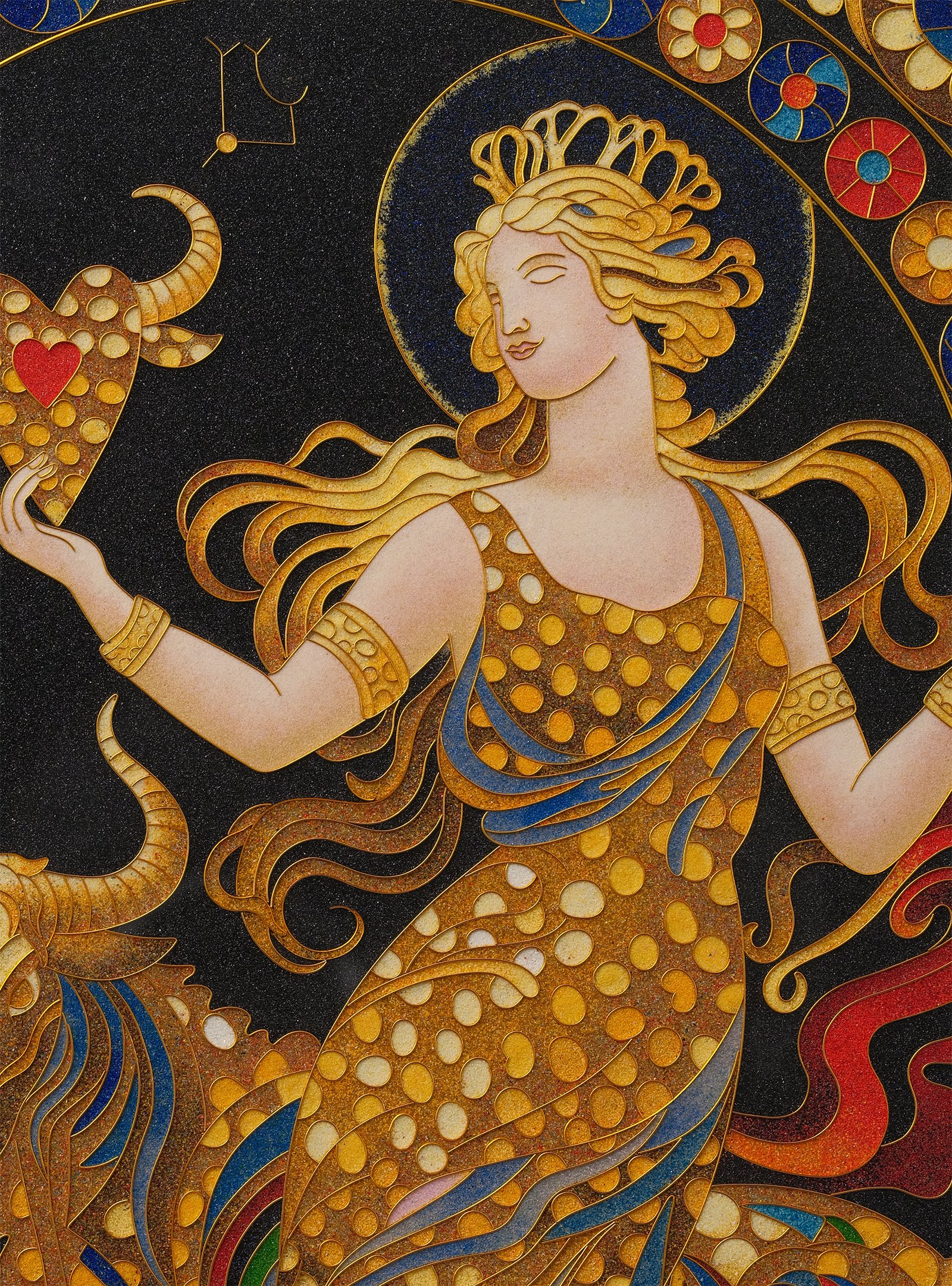 Color sands fill filigree lines, with blue waves and golden star trails glowing like gems under careful application.