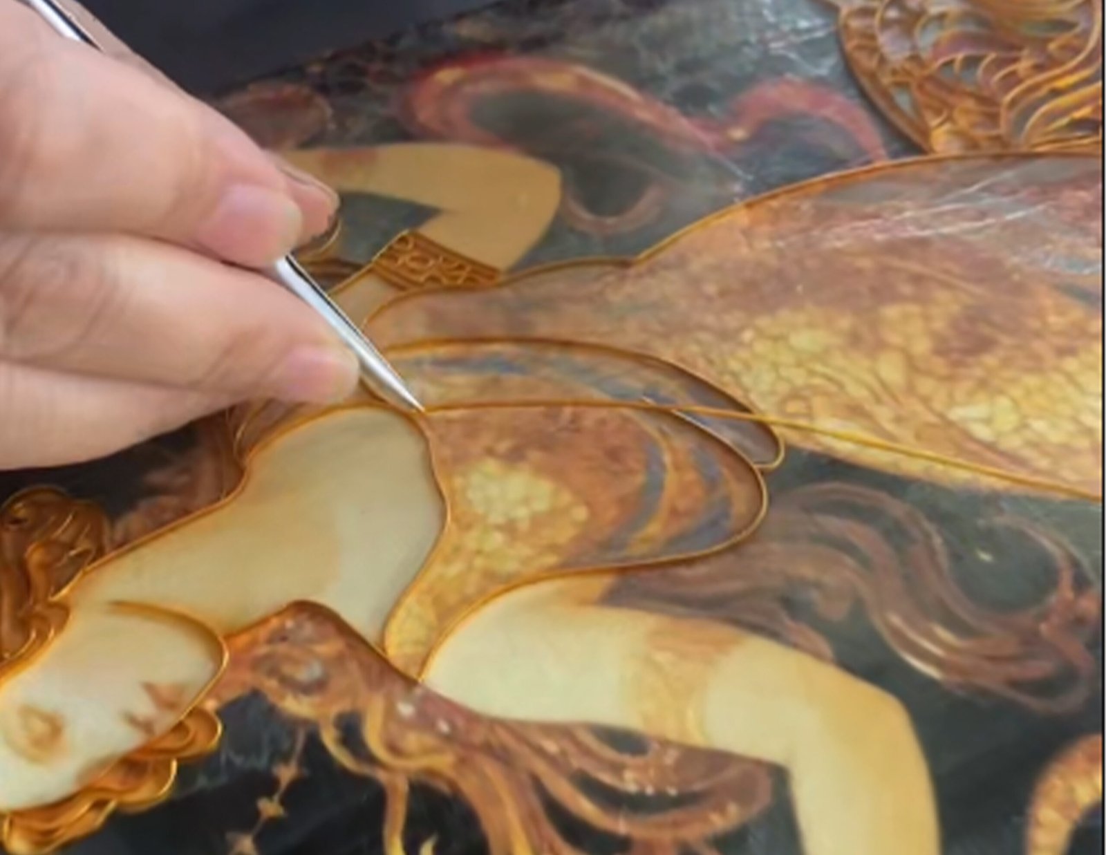 Craftsmen bend gold foil wires into precise patterns, forming the artwork’s golden skeletal structure.